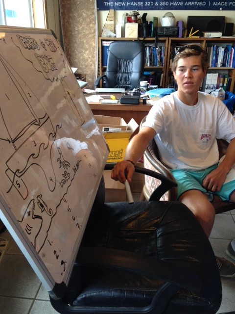 Aft Deck – this kid runs the electric motor when needed, and trims the mainsheet while sailing. The aft deck person uncoils the mainsheet at the start and recoils it at the end.